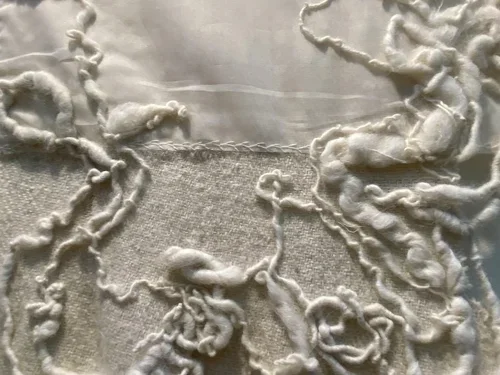 Brown bayeta with white bayeta and natural shades of brown and grey alpaca with orange wool yearn needlecraft. Organdy insets. Currently owned by Hemenway Foundation. (60”W x 72” H)