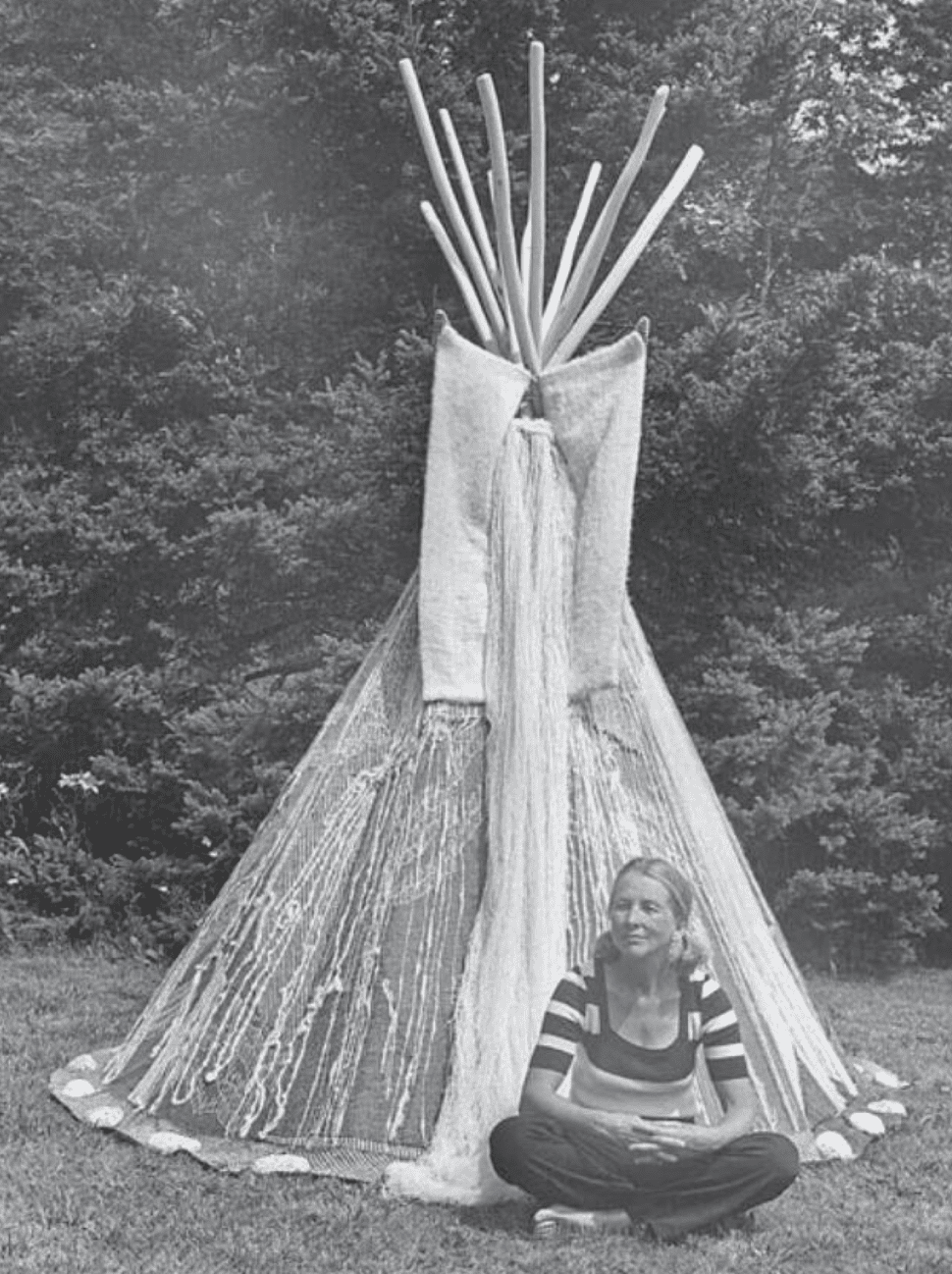 In her final evolution of fiber artistry, Hemenway expanded her repertoire of fiber art by pulling tapestry off the wall and inviting the viewer to experience fiber art in three-dimensional space. Crafted for an international exhibition in Beijing, Hemenway’s Tipis sought to honor and elevate one of the most iconic American structures—the American Indian Tipi.